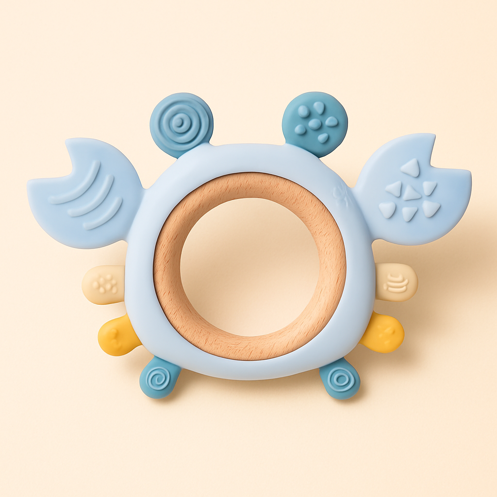 Dieses liebevoll gestaltete Beißspielzeug kombiniert weiches, lebensmittelechtes Silikon mit einem natürlichen Holzring – perfekt abgestimmt auf die Bedürfnisse zahnender Babys. Das niedliche Tierdesign zieht die Aufmerksamkeit deines Kindes an und regt die Sinne an.