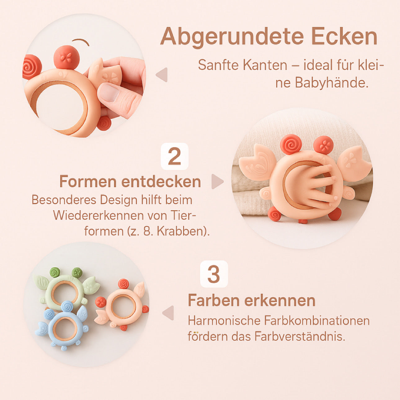 Dank der verschiedenen Strukturen fördert das Spielzeug sowohl die orale als auch die motorische Entwicklung – ideal für Babys ab Geburt bis ins Kleinkindalter.
